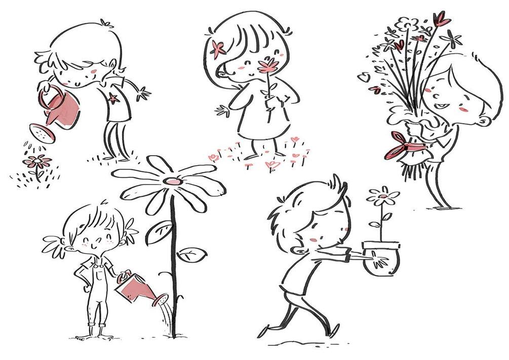 children, flowers, spring, plant, flowerpot, watering, bouquet, smelling, planting, growing, farm, vegetation, wild, child, girl, infancy, child, isolated, white background, illustration, drawing, black and white