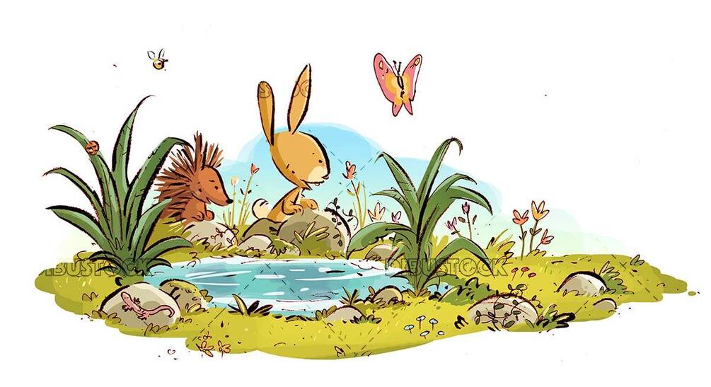 puddle, lake, river, animals, rabbit, hedgehog, spring, insect, nature, butterfly, plants, flowers, child, wild