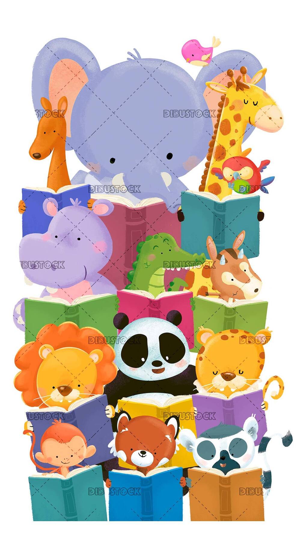animals, children, infant, reading, reading, reading, cute, panda, giraffe, elephant, lion, lemur, head, parrot, cheetah, hippo, gazelle, kangaroo, crocodile, bow, illustration, drawing, cartoon, isolated, trimmed, white background