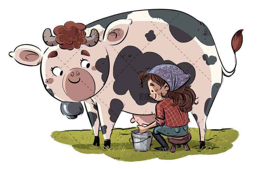 girl, cow, farm, milking, milk,fatil illustration, animal, mammal, dairy, farmer, field, illustration, drawing, cartoon, childhood, infant, seated, isolated, trimmed, white background, funny, happy, merry