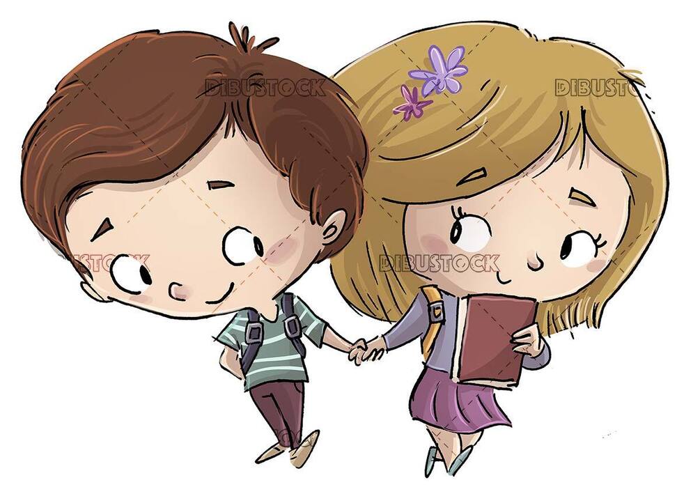 children, children, in love, holding hands, Valentine's Day, love, heart, education, pupils, students, book, happiness, cute, childhood, child, cartoon, isolated, clipped, white background, illustration