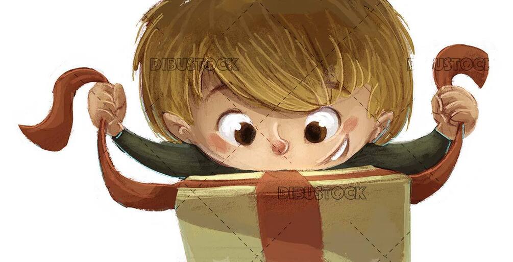 child, gift, surprise, present, ribbon, box, christmas, birthday, celebration, party, cute, child, childhood, texture, illustration, cartoon, cartoon, face, happy, isolated, trimmed, white background