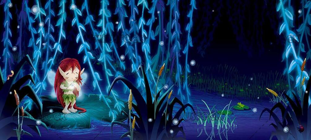 hada, ninfa, noche, luciérnaga, pantano, nenúfar, infantil, niños, mágico,ilustracion infantil,dibujo,dibujo animado,cuco,infancia,