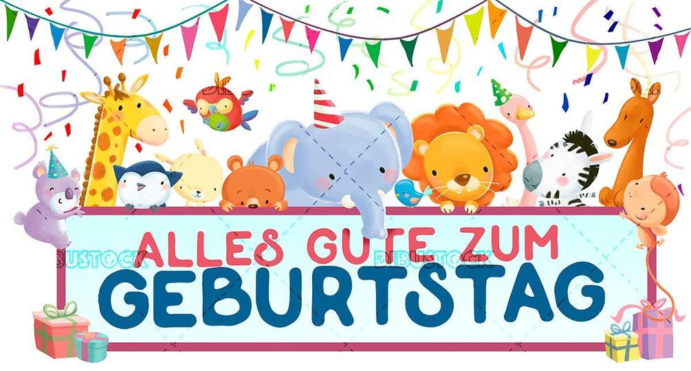 greeting, birthday, party, celebration, infant, animals, baby, children, confetti, poster, banderilla, animal, infant illustration, elephant, giraffe, lion, kangaroo, zebra, monkey, parrot, koala, rabbit, bear, illustration, drawing, cartoon, isolated, trimmed, white background, ostrich